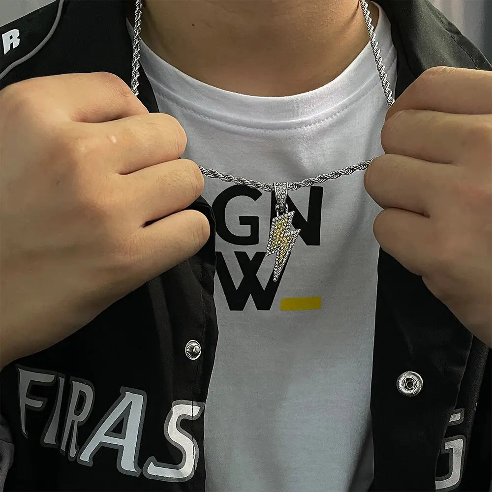 Introducing the Full Zircon Lightning Pendant Necklace by Tide Brand! This unique and stylish pendant is perfect for making a fashion statement and turning heads. Crafted with stainless steel, it is incredibly durable and definitely built to last. This necklace comes with the perfect combination of zircon and lightning design that adds elegance and sophistication to your look. It is ideal not just for parties but also for adding that extra touch to your everyday streetwear or hip-hop style. Whether you are attending a special event or simply want to be the life of the party, this lightweight and comfortable necklace will leave you feeling confident and looking great. Step up your style game with this timeless piece today!